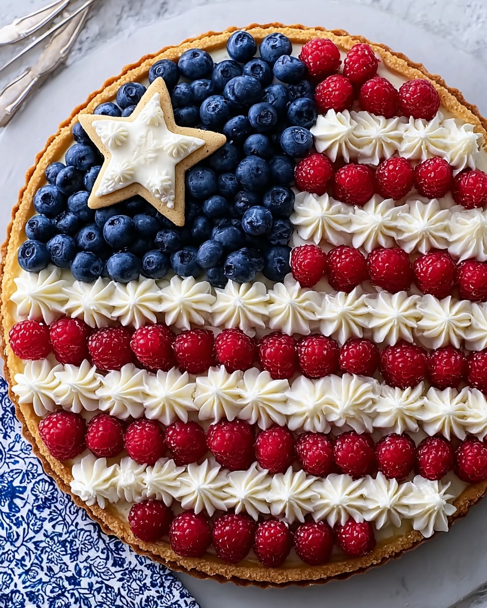 Once your cookie crust is cooled and your cream cheese filling is perfectly fluffy, it’s time to craft your edible flag. Spread the filling in an even layer over the base, covering it generously from edge to edge. Arrange the raspberries in horizontal rows to represent the red stripes—take your time to lay them out nicely for visual impact. Then, create a blue square on the top left corner using the blueberries in neat clusters to mimic the stars on the flag. Step back and admire your festive masterpiece before serving.
