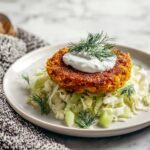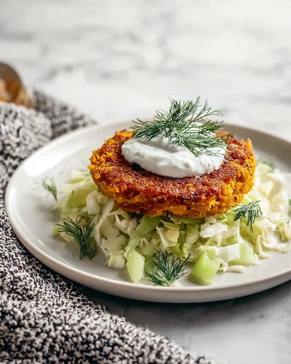 Serve those warm, crispy salmon burgers atop a generous bed of creamy cabbage slaw. For extra flair, add a dollop of yogurt, a swirl of olive oil, and sprinkle some more fresh herbs on top. This step not only adds to the flavor but also makes the presentation truly inviting. Each bite combines the crispy, tender, creamy, and fresh perfectly—this is what makes this recipe a crowd-pleaser every time.