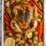 A flavorful spatchcock chicken roasted in the oven with a zesty garlic-lemon butter and a medley of roasted vegetables including red potatoes, carrots, and Brussels sprouts. This method ensures crispy skin and juicy meat in less time than a whole roasted chicken.