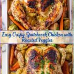 Spoon about two-thirds of the lemon-garlic butter under the loosened skin, spreading it evenly over the breast and thighs. Carefully dot the remaining butter over the outside of the chicken; this will help the skin crisp up gorgeously during roasting. This step may seem a bit intricate, but trust me, it’s the magic touch your Spatchcock Chicken with Roasted Vegetables Recipe deserves.