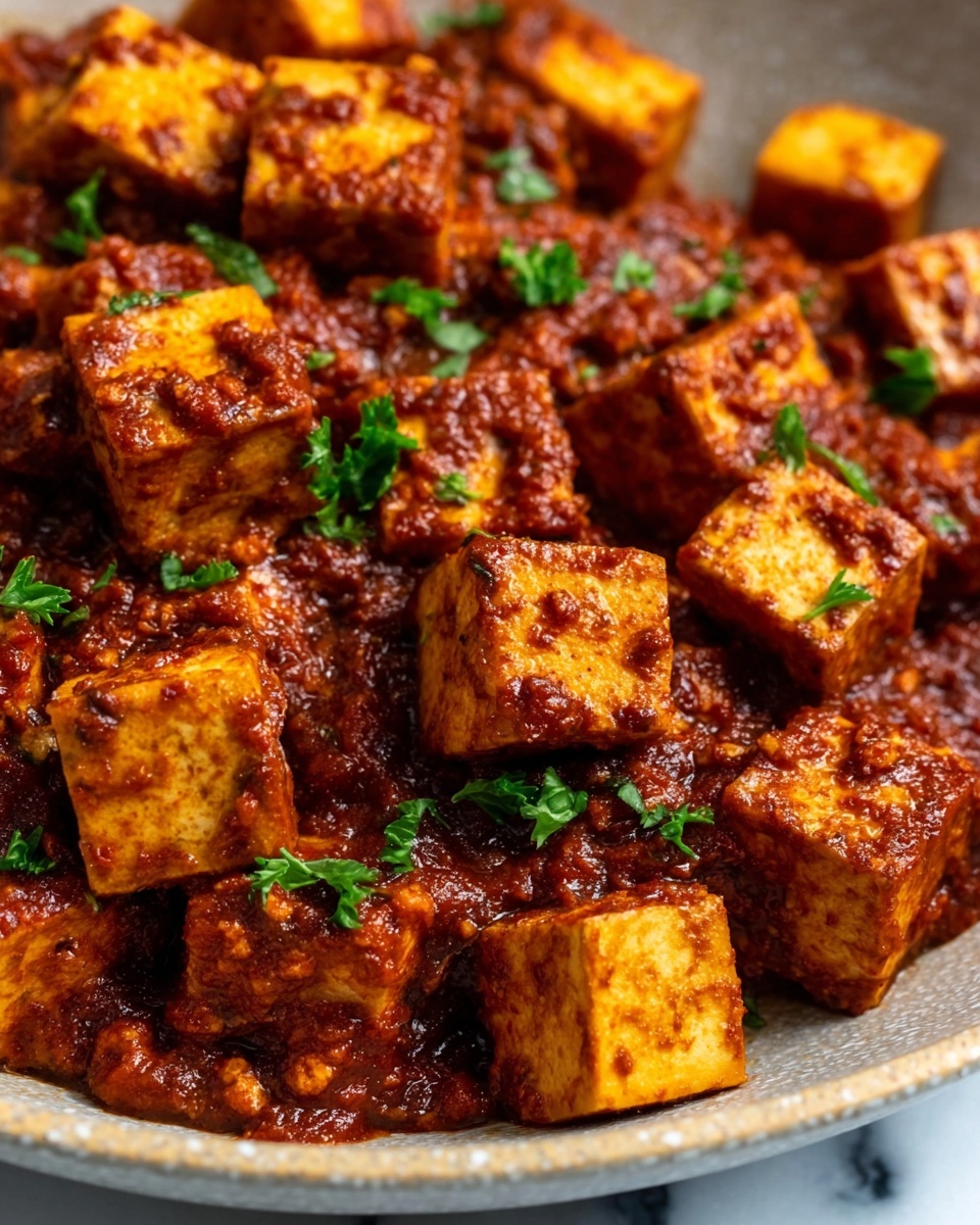 Reheat gently in a skillet over medium heat or in the microwave, adding a splash of water if the sauce has thickened too much. Stir often to keep the tofu tender and the sauce evenly warmed.