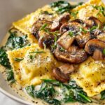 This Spinach Mushroom Alfredo Ravioli recipe offers a homemade pasta experience filled with a savory blend of sautéed mushrooms, fresh spinach, Parmesan, and ricotta cheese, all tossed in a rich, creamy Alfredo sauce. Perfect as a comforting dinner, this dish combines the elegance of fresh ravioli with the indulgent flavors of classic Alfredo, making it a crowd-pleaser that’s both satisfying and straightforward to prepare.