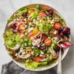 - Garnish: Transfer the tossed salad to a serving bowl and sprinkle the remaining feta cheese and chopped walnuts on top for added texture and presentation.