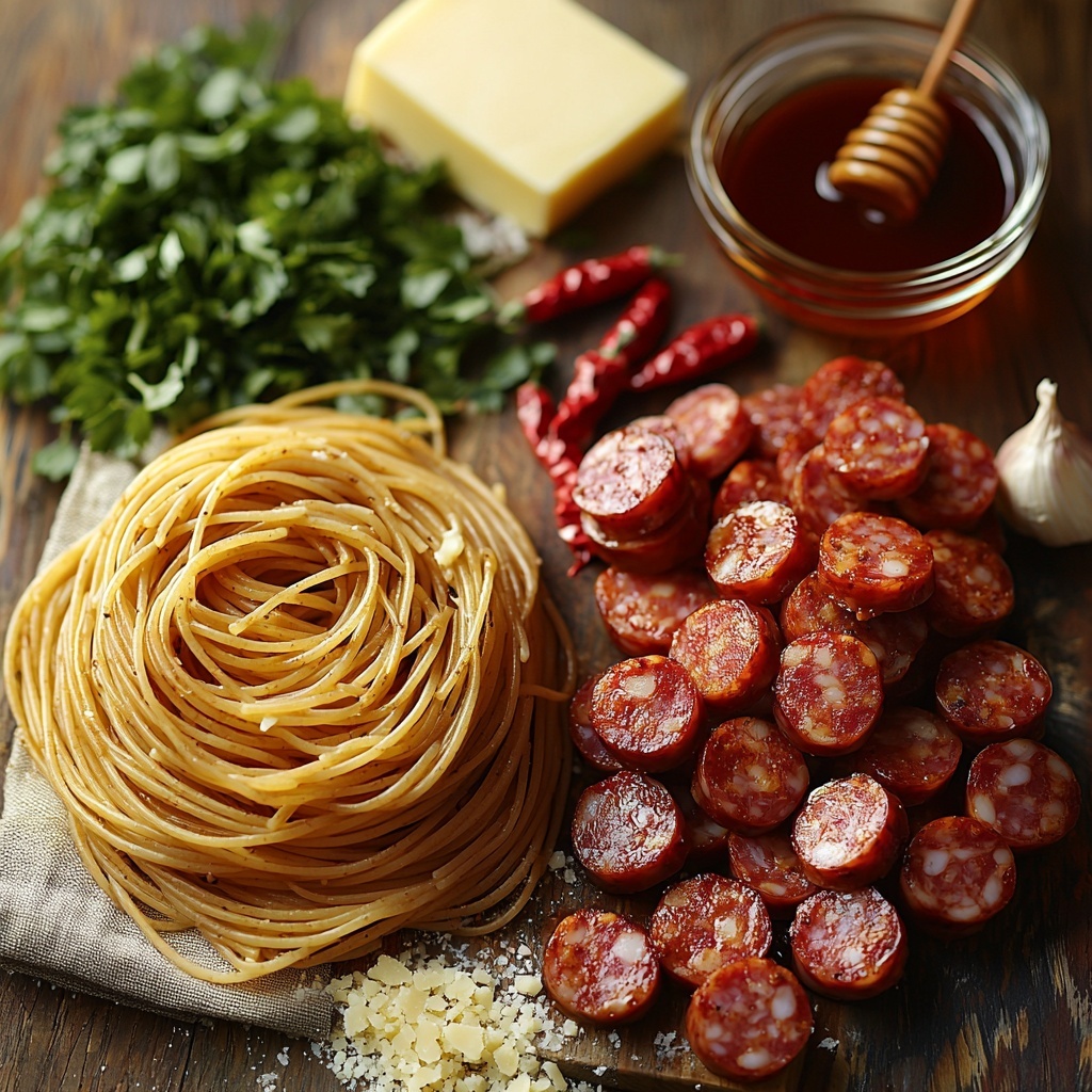The magic behind this Sticky Honey Garlic Sausage Pasta Recipe lies in a handful of simple yet powerful ingredients. Each one plays a starring role—from the smoky sausage that adds depth and texture, to the honey and garlic combination that brings a luscious, sticky glaze that clings beautifully to every noodle. Let’s break down what you need to gather before cooking.