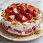 Strawberry Delight Crunch Cake is a no-bake, layered dessert featuring a crunchy graham cracker crust, a creamy whipped cream cheese filling, and fresh strawberries drizzled with sweet strawberry jam. Chilled to perfection, this refreshing treat is perfect for summer gatherings or any special occasion.