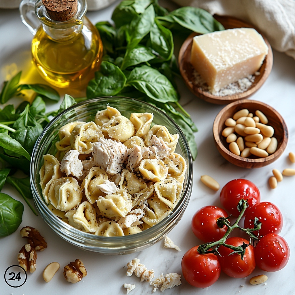 The magic of this Summer Chicken Pesto Tortellini Recipe lies in its beautifully balanced, simple ingredients. Each component plays a crucial role—from the tender chicken providing hearty protein, to the fresh basil bringing an herby brightness, and the cheese-filled tortellini adding comforting richness and texture.