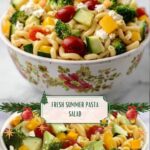 A vibrant and refreshing Summer Pasta Salad loaded with fresh vegetables like cherry tomatoes, summer squash, zucchini, broccoli, and edamame, tossed in a tangy homemade dressing with feta cheese. Perfect for a light lunch or a picnic side dish.