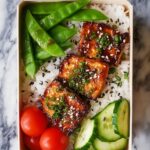 - Assemble the Bento Box: Divide the cooked rice between two lunch boxes. Arrange the glazed tofu cubes, pickled cucumbers, sugar snap peas, and cherry tomatoes neatly in compartments for a visually appealing and balanced meal.