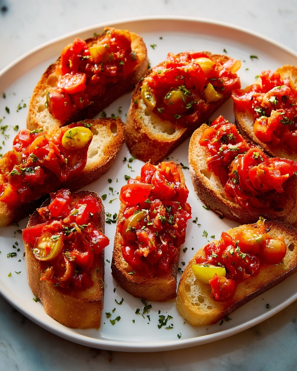 For a party, serve these on a large wooden board with extra basil sprigs for a rustic look. Try stacking the toasted slices in a staggered pile or arranging the bruschetta on colorful ceramic plates to make your Tomato & Nduja Bruschetta Recipe shine at any gathering.