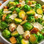 A savory Warm Brussels Sprout Caesar Salad featuring roasted Brussels sprouts tossed in a creamy, tangy Caesar dressing, topped with toasted breadcrumbs or croutons, Parmesan cheese, and optional crispy bacon or pancetta for added flavor. A perfect blend of roasted veggies and classic Caesar taste served warm.