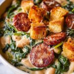 This White Bean and Smoked Sausage Skillet is a hearty, comforting dish combining tender cannellini beans, smoky andouille or kielbasa sausage, and vibrant Tuscan kale. Enhanced with fragrant herbs, garlic, and creamy Boursin cheese, it is topped with crispy homemade sourdough croutons for a satisfying texture contrast, making it a perfect easy weeknight meal.