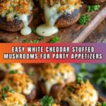 These White Cheddar Stuffed Mushrooms are a delicious and easy-to-make appetizer featuring large white button mushrooms filled with a savory mixture of sautéed mushroom stems, garlic, onion, and a blend of sharp white cheddar and Parmesan cheeses. Baked until golden and bubbly, they make a perfect party snack or starter for any occasion.