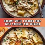 White Lasagna Soup is a comforting and hearty one-pot meal that combines the flavors of classic Italian lasagna with the ease of a soup. This creamy, cheesy soup features savory Italian sausage, tender broken lasagna noodles, white beans, and fresh spinach, all simmered to perfection in a rich broth and topped with creamy ricotta and fresh basil for a delightful finish.