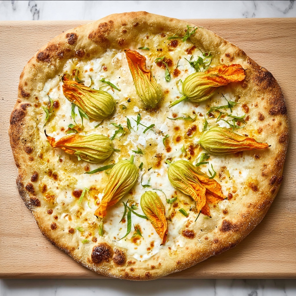 This delightful Zucchini Flower Pizza features a thin, crisp crust topped with melted mozzarella, herby goat cheese-stuffed zucchini flowers, and fragrant fresh basil. Perfect for a light, elegant meal that marries fresh garden flavors with gooey cheese in an easy-to-make baked pizza.
