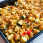 Pop the baking dish into your preheated oven and bake for 30 minutes. During this time, the vegetables start to soften and mingle their flavors, while the breadcrumbs begin to crisp, promising that irresistible texture in your final dish.